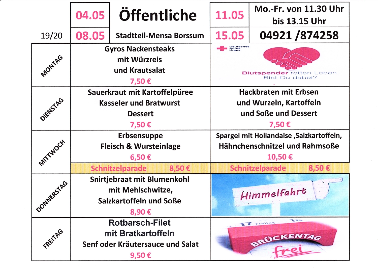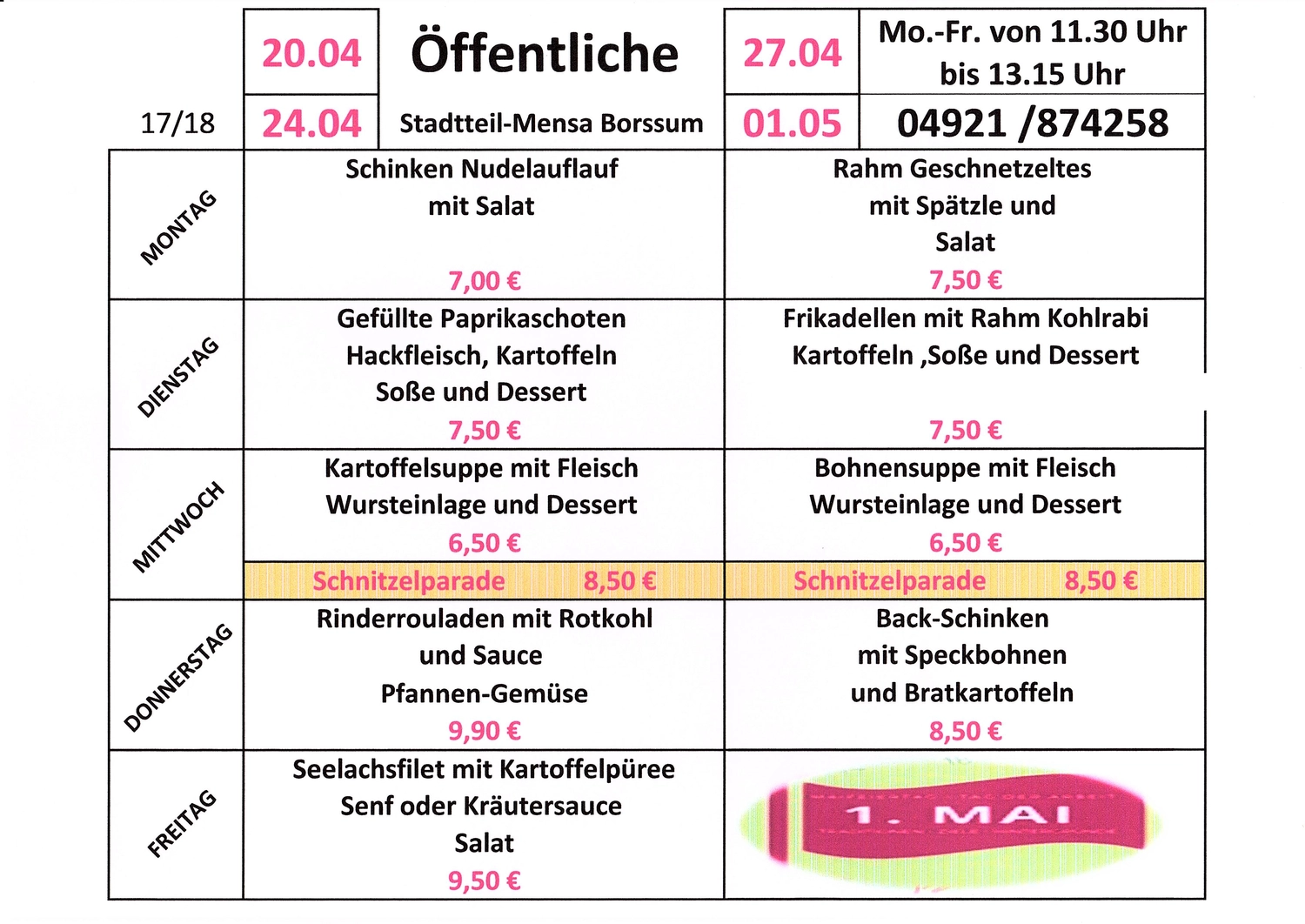Menüplan für April/MaiBitte wenn möglich vorbestellen